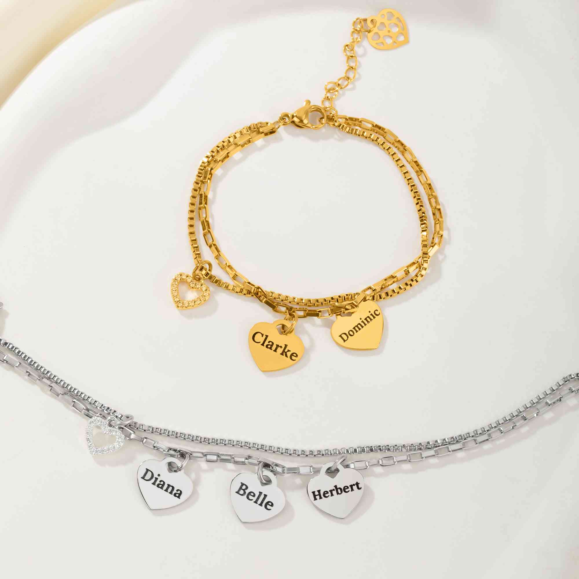 • Custom Name Bracelet with 1-6 Heart Charms, Double Chain Bracelet, Family Jewelry, Mother's Day/Anniversary/Birthday Gift for Mom/Grandma/Family/Her
