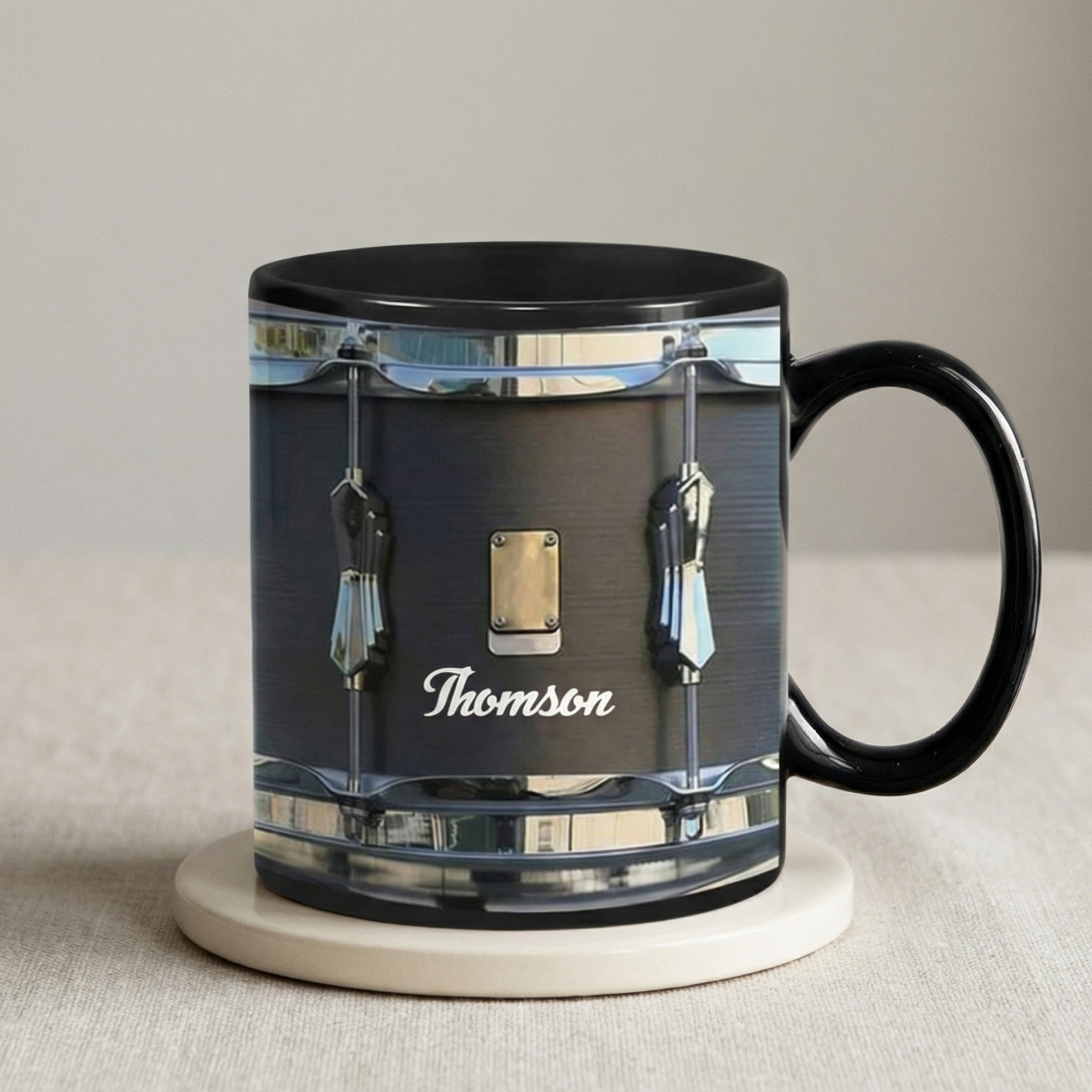 Custom Name on a Drum – A personalized name is elegantly printed on the front, transforming this mug into a meaningful tribute to the drummer’s identity. The clean script adds a touch of individuality to a bold, musical design.